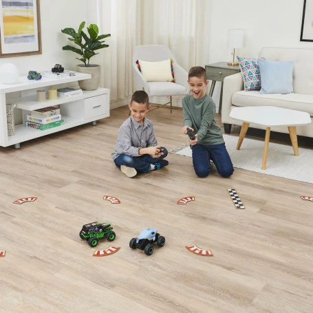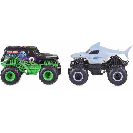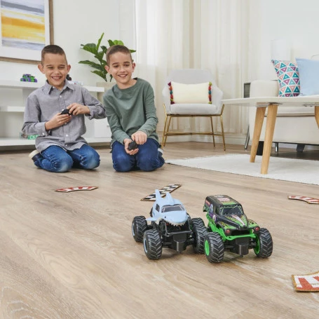 Race your favorite Monster Jam trucks head-to-head with the 1:24 scale Racing Rivals 2-Pack! This exclusive remote control set includes Grave Digger and Megalodon, plus eight track pieces and a start/finish line to create your own Monster Jam arena! Choose Grave Digger or Megalodon and race against your friends in an epic face-off! With two easy-to-use dual joystick controllers and 10 AAA batteries included, you can control your Monster Jam RC trucks from up to 200 feet away and roll right out of the box! Featuring authentic Monster Jam styling, official BKT tires and look-alike chassis, the 1:24 scale Grave Digger and Megalodon always deliver big fun! Race and perform awesome stunts, crazy crashes and brutal bashes! Host your very own Monster Jam rally and bring the action home with the all-new, official 1:24 scale remote control Racing Rivals 2-Pack!
